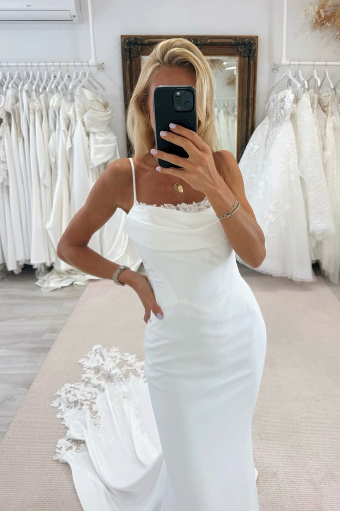 Simple Mermaid Spaghetti Straps White Satin Wedding Dresses with Lace Appliques VK25093002