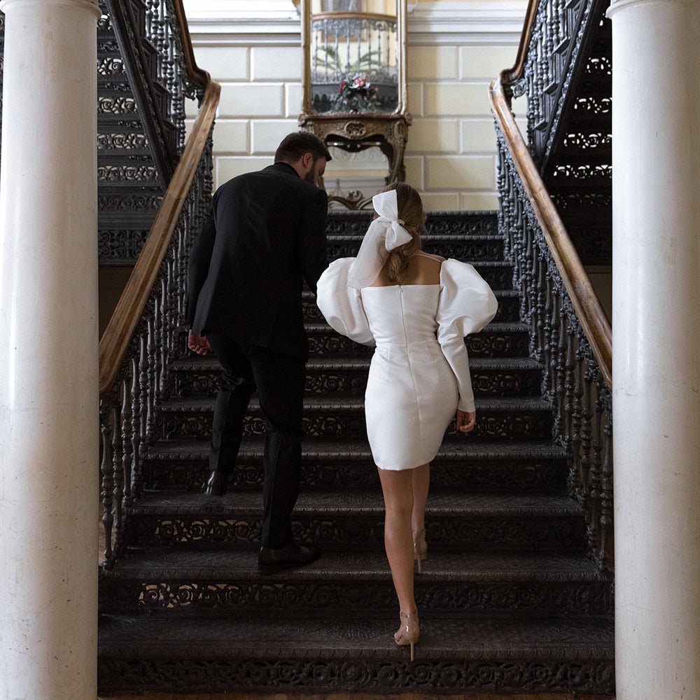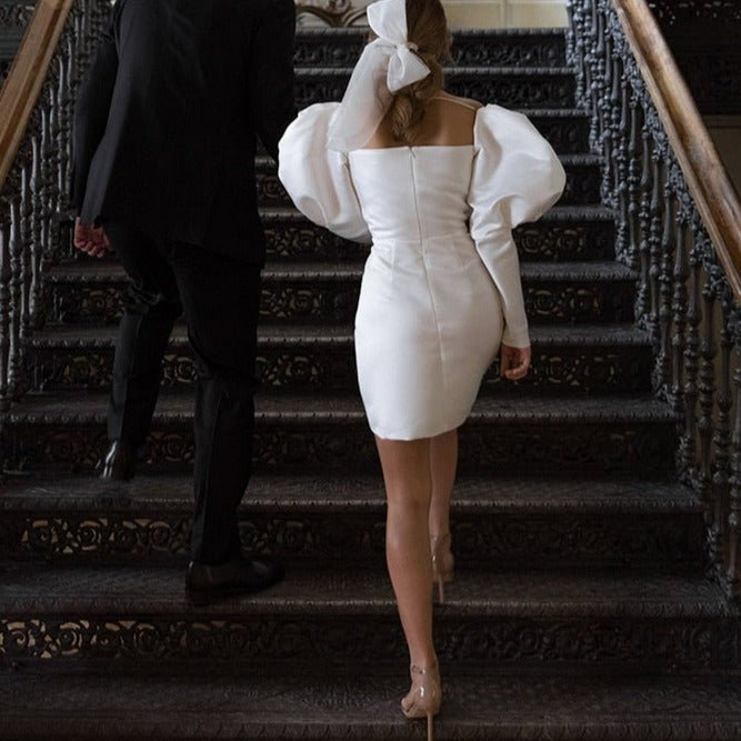 White Satin Short Wedding Dress with Puff Sleeves VK25100201