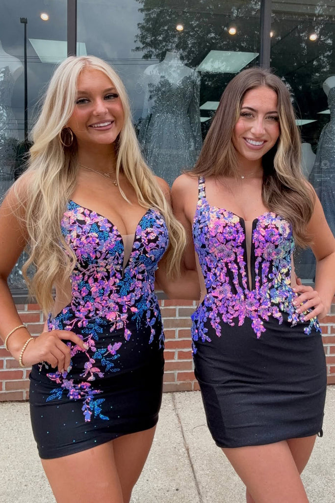 Cute Bodycon V Neck Black Stretch Satin Homecoming Dress VK080604