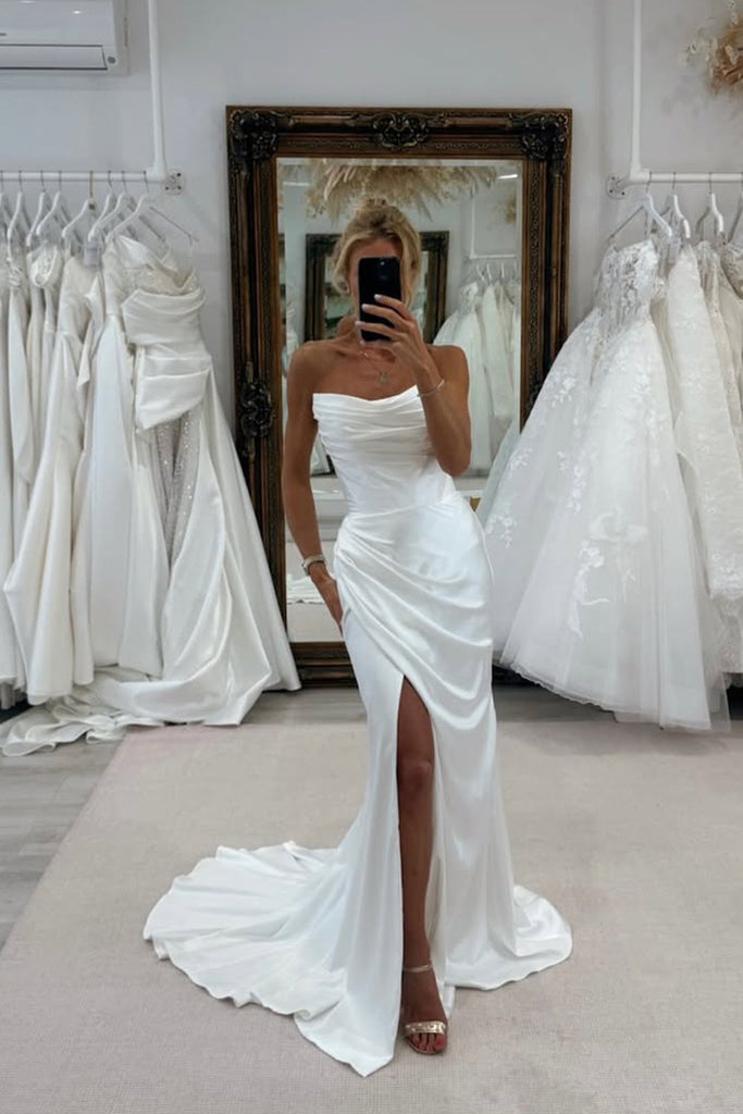 Sheath Scoop Neck Silk Satin Wedding Dress with Slit VK25112405