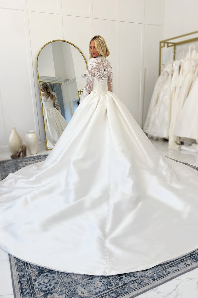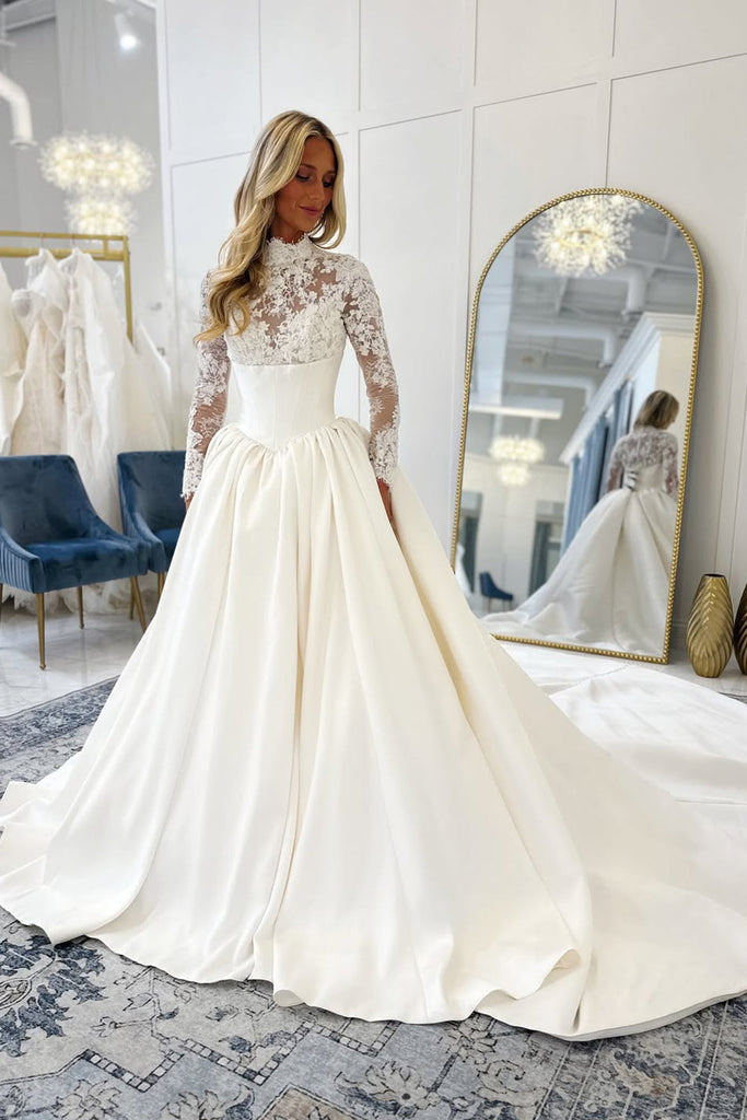 Vintage Ball Gown High Neck Lace Satin Wedding Dress with Long Sleeves VK15112707