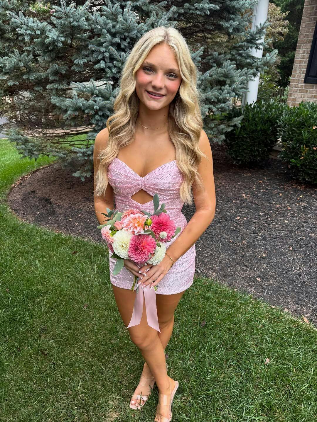 Sparkling Strapless Pink Backless Fitted Homecoming Dress with Keyholes VK25092502