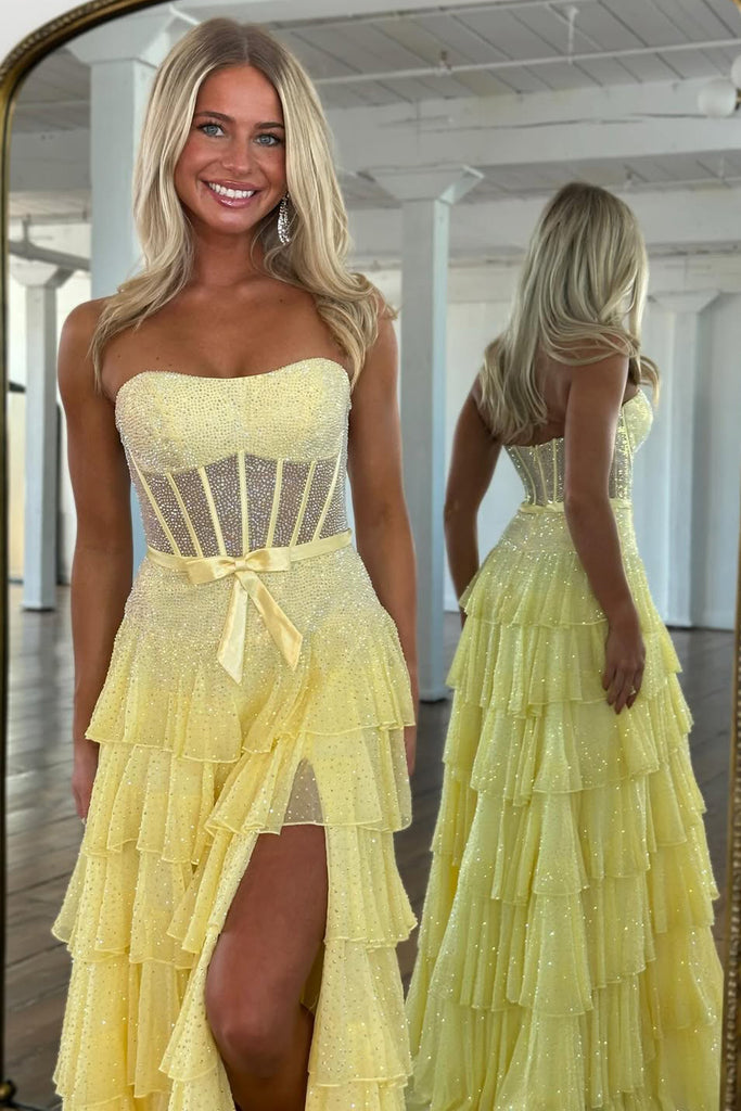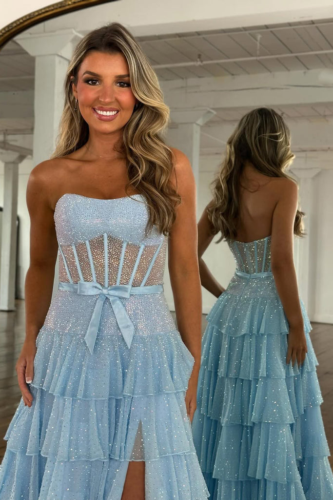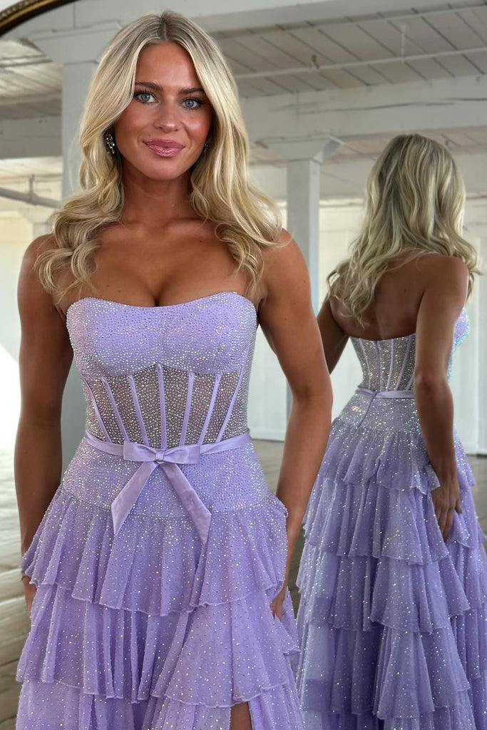 A-Line Strapless Lilac Ruffle Tiered Beaded Long Prom Dresses with Slit VK26012709