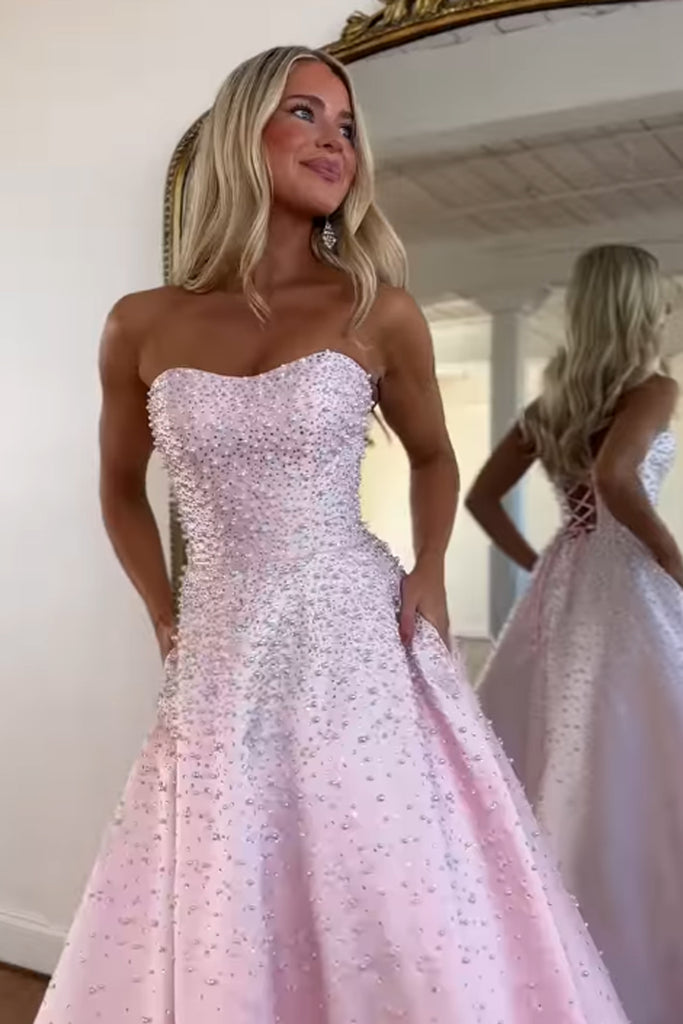 A-Line Strapless Pink Beads Long Prom Dresses with Slit VK26020102