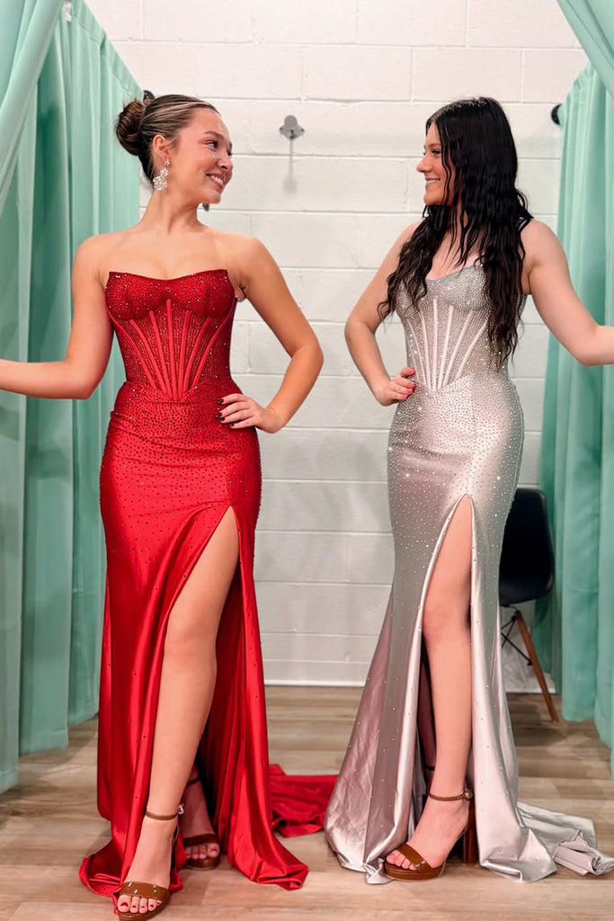 Cute Mermaid Sweetheart Red Hot Fix Satin Prom Dress with Slit VK26021108