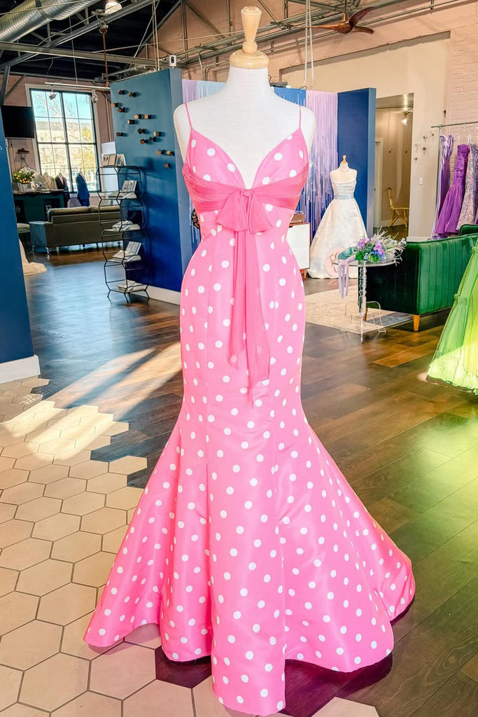 Cute Mermaid V Neck Pink White Dot Satin Long Prom Dress VK16020304