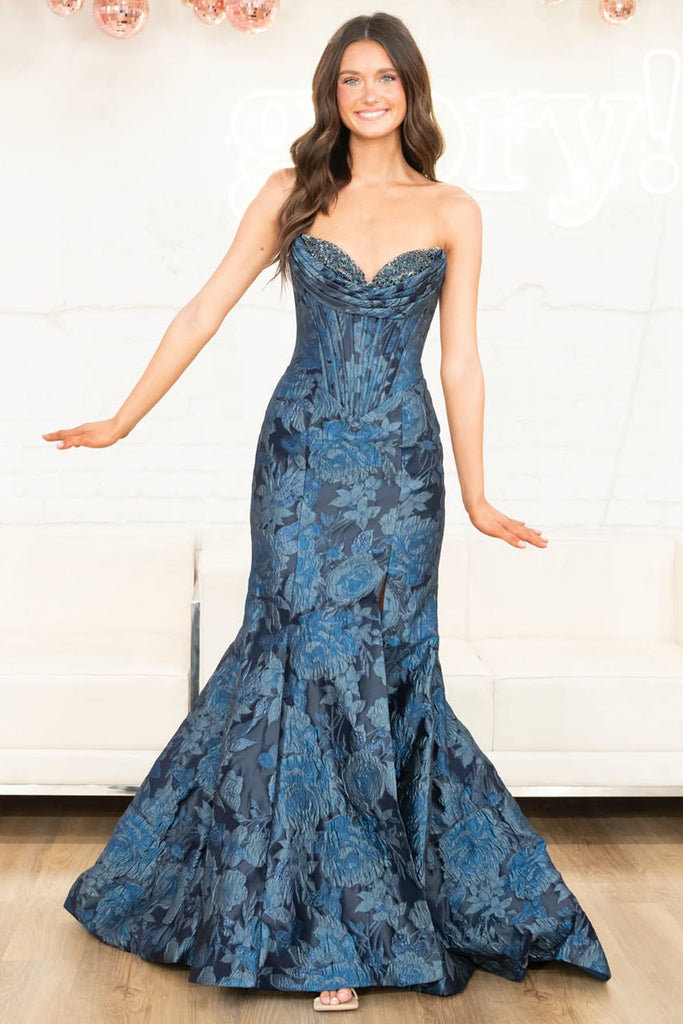 Fashion Mermaid Sweetheart Floral Jacquard Satin Prom Dress with Slit VK16020606