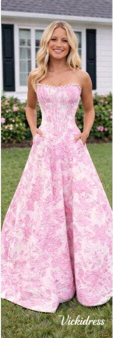 Gorgeous A Line Scoop Neck Jacquard Satin Prom Dress with Pearls VK25121501