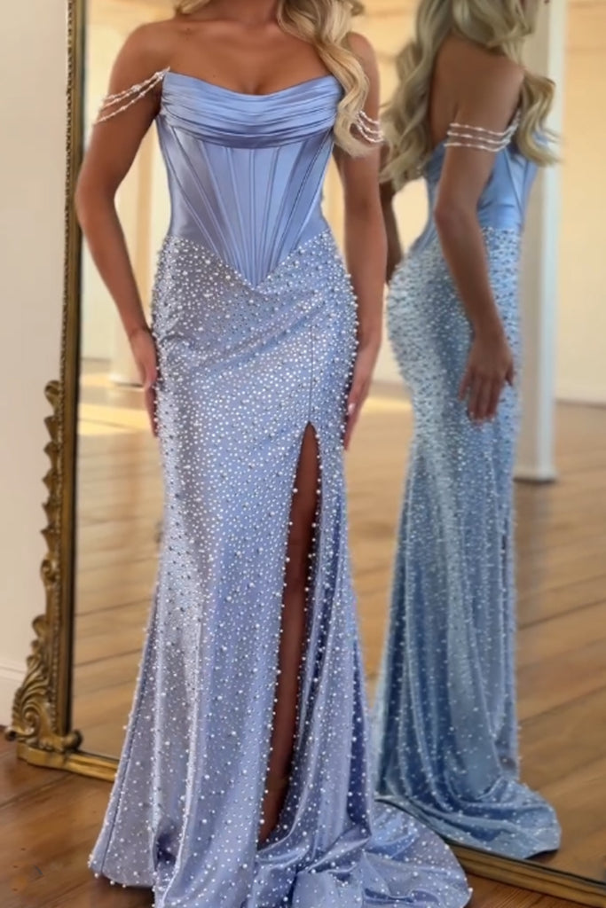 Mermaid Off the Shoulder Blue Corset Long Prom Dresses with Slit VK26020201
