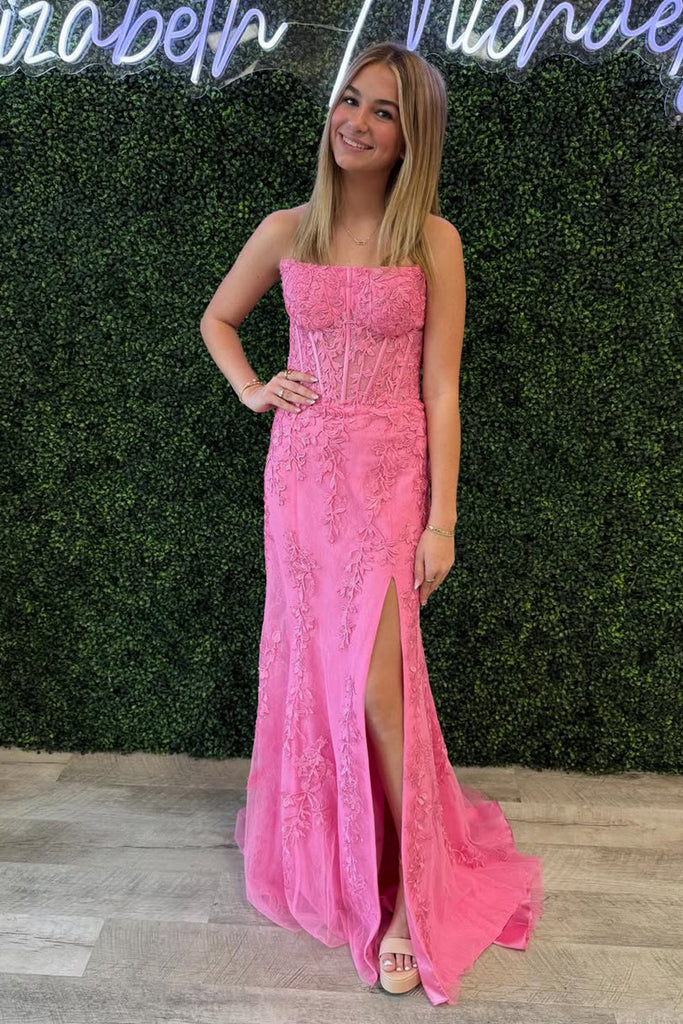 Mermaid Scoop Neck Pink Lace Prom Dress with Slit VK162407