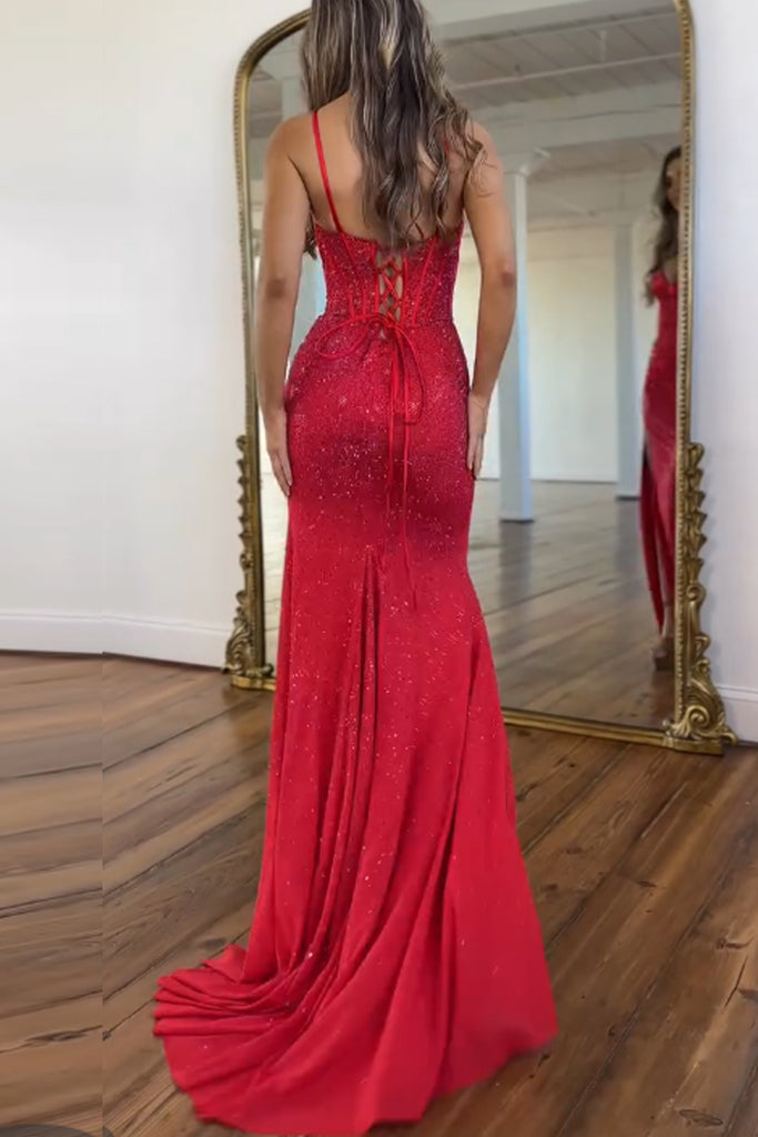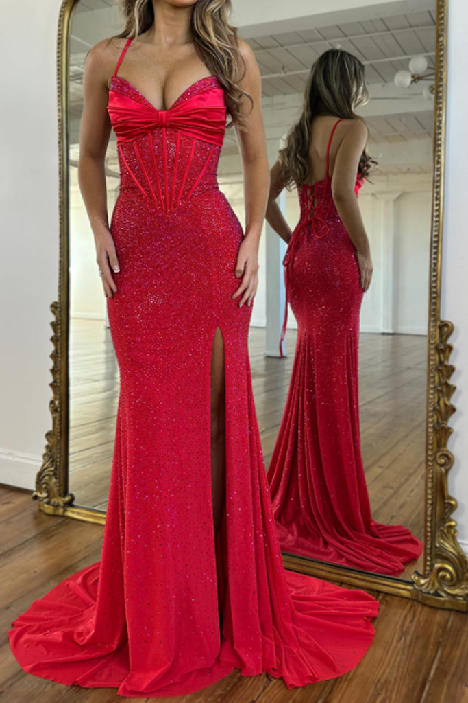 Mermaid Spaghetti Straps Red Corset Beads Long Prom Dresses with Slit VK26020101
