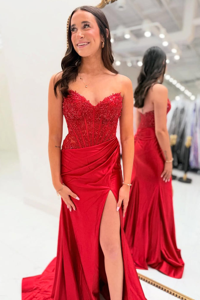 Mermaid Strapless Red Corset Appliques Long Prom Dresses with Slit VK26012902