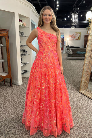 Cute One Shoulder Pink Sequins Lace Prom Dresses with Slit