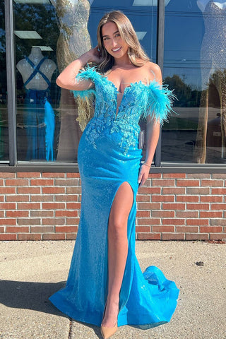 Charming Mermaid Off the Shoulder Blue Sequins Lace Slit Prom Dress