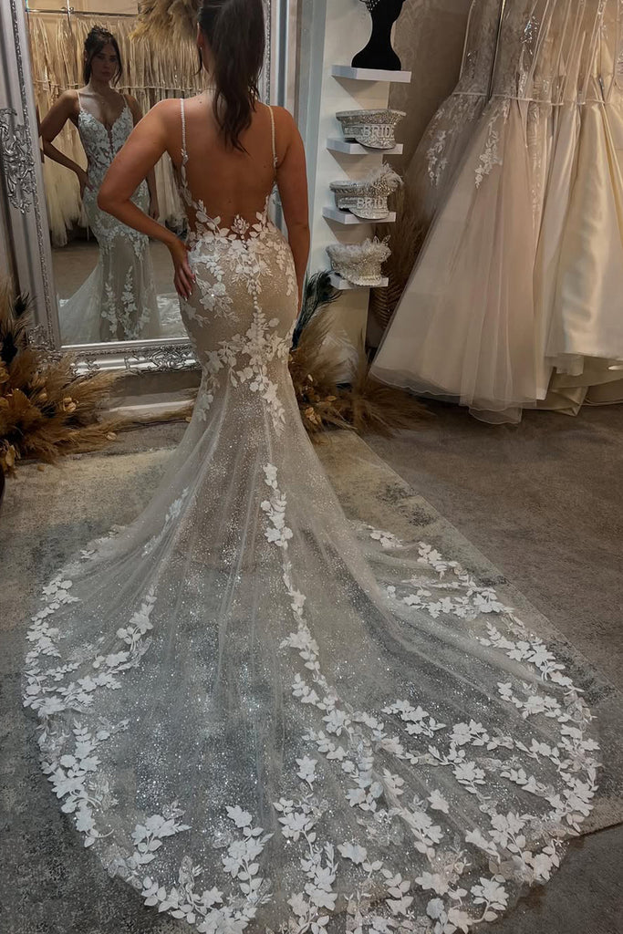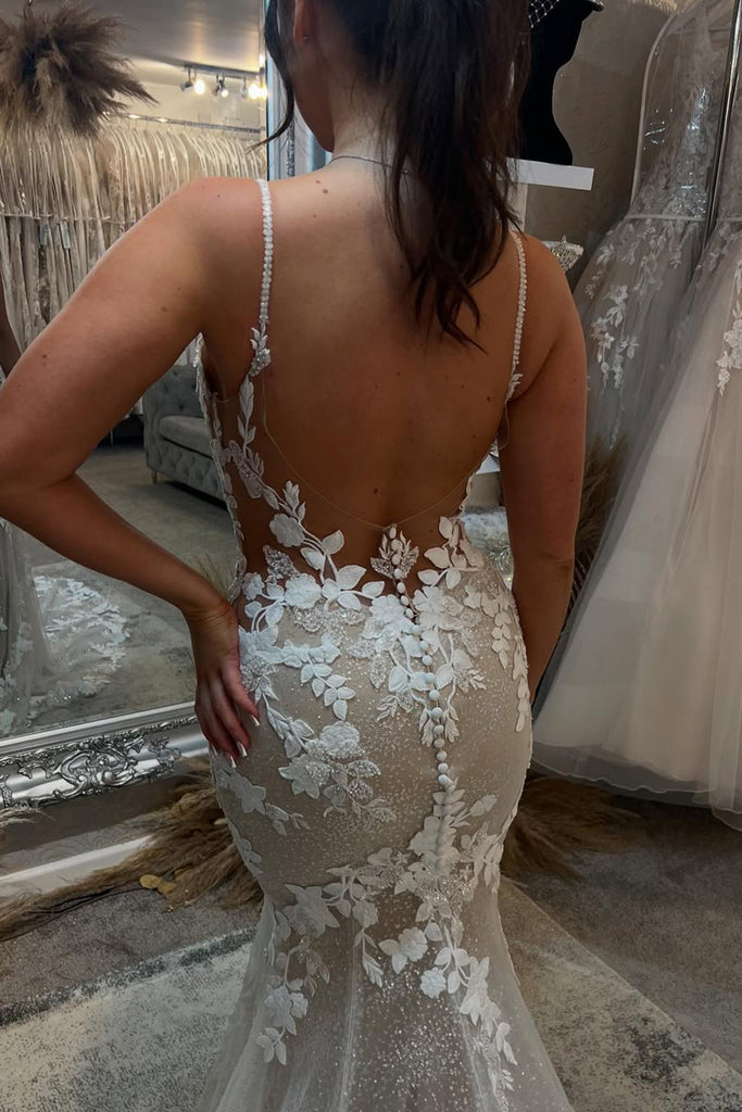 Charming Mermaid V Neck Dark Champagne Wedding Dress with Appliques VK25052906
