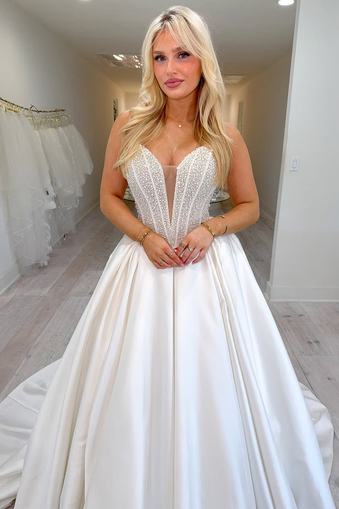Charming A-Line Sweetheart White Satin Pearls Corset Wedding Dresses with Beadings VK25102807