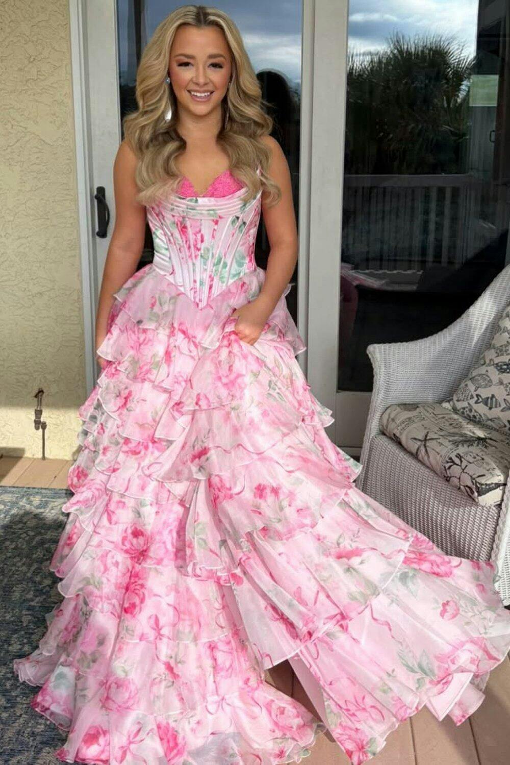 Cute A Line Sweetheart Pink Floral Chiffon Prom Dress with Slit VK15112702