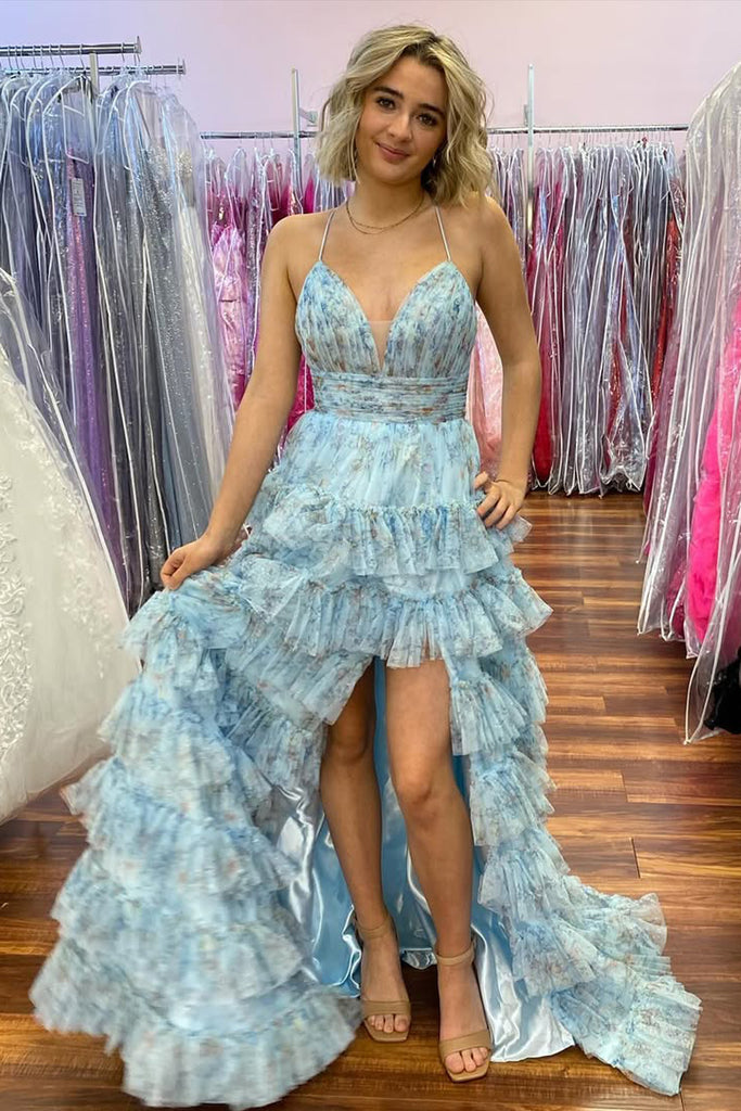 Fairy A Line V Neck Floral Printed Tiered Tulle Prom Dress with Slit VK25010205
