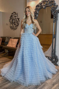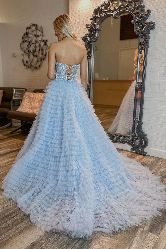 Light Blue Strapless Ruffle Tiered Tulle Long Prom Dresses with Appliques VK24012201